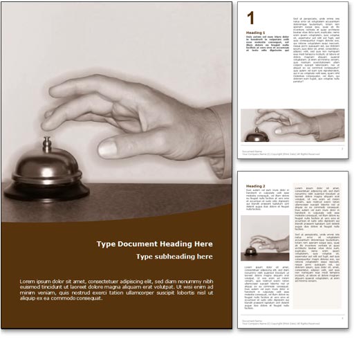 The Service Word Template in orange shows a man about to ring the service bell on a counter typical of a hotel, concierge service or customer service desk. The Microsoft Service Word Template is the perfect Word Template design for any support paper, feedback review, service industry publication, help document, service report, hotels newsletter and customer services brochure.