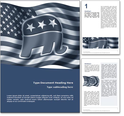The Republican Candidate Word Template in blue shows the Republican Party emblem and symbol of the elephant first drawn by political cartooinist Thomas Nast in 1847 for the Grand Old Party (GOP). The Republican Candidate Microsoft Word Template is the ideal Word Template design for any presidential election paper, Republication Party publication, Republican primaries inviatation, US elections document, Republican Candidates report, presidential debate review, 2012 elections journal, Grand Old Party newsletter or campaign trail brochure.